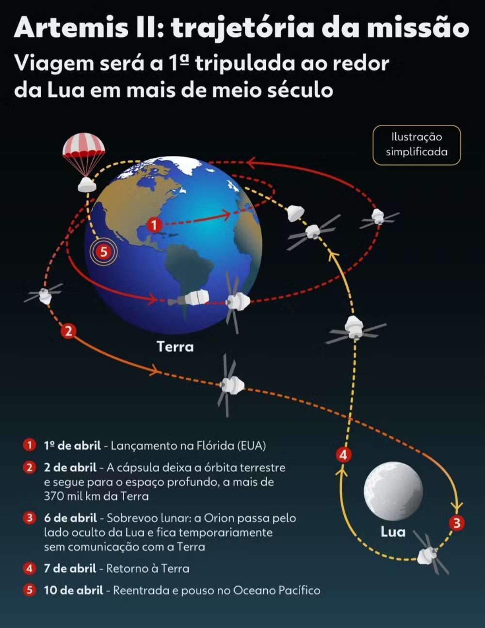 Agora, a missão segue em andamento. Nas próximas horas e dias, os astronautas devem deixar a esfera de influência gravitacional da Lua, realizar queimas de correção de trajetória e conduzir experimentos a bordo antes da amerissagem prevista para 10 de abril no Oceano Pacífico.